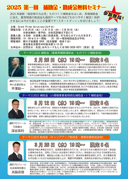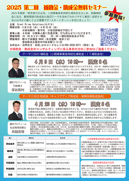 - GPS主催 2025第一回補助金・助成金セミナーの日程が決まりました。